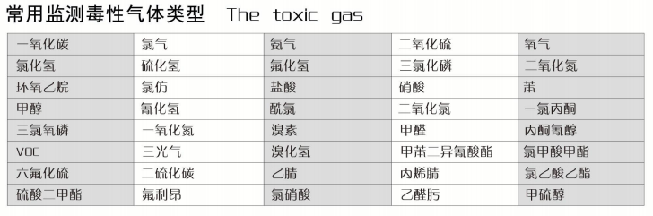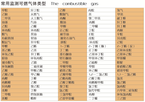 常見氣體檢測列表: